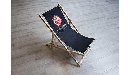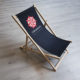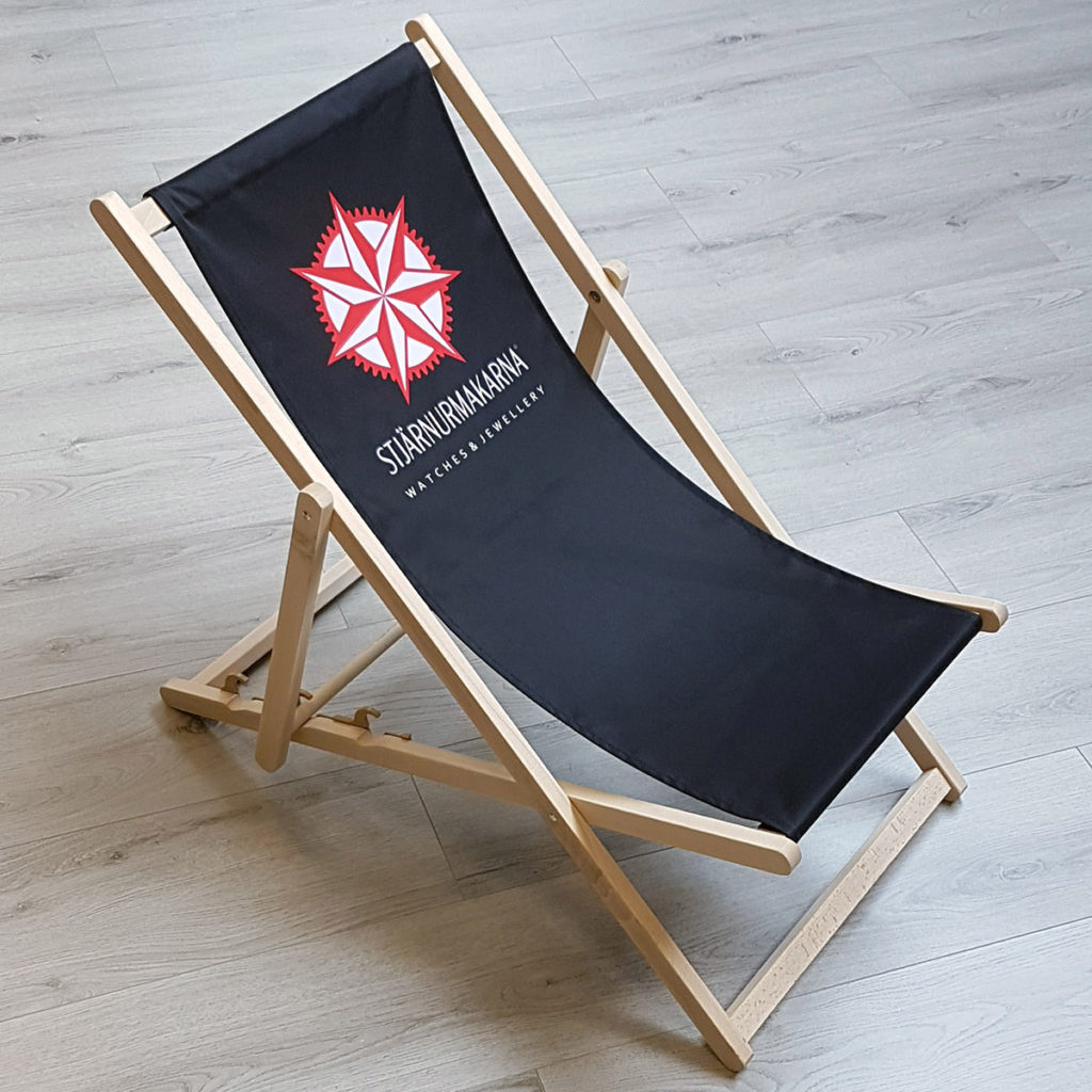 Solstol med eget tryck. Passar bra till sommareventet. Stolen kan ställas i tre positioner och är enkel att ta med sig.